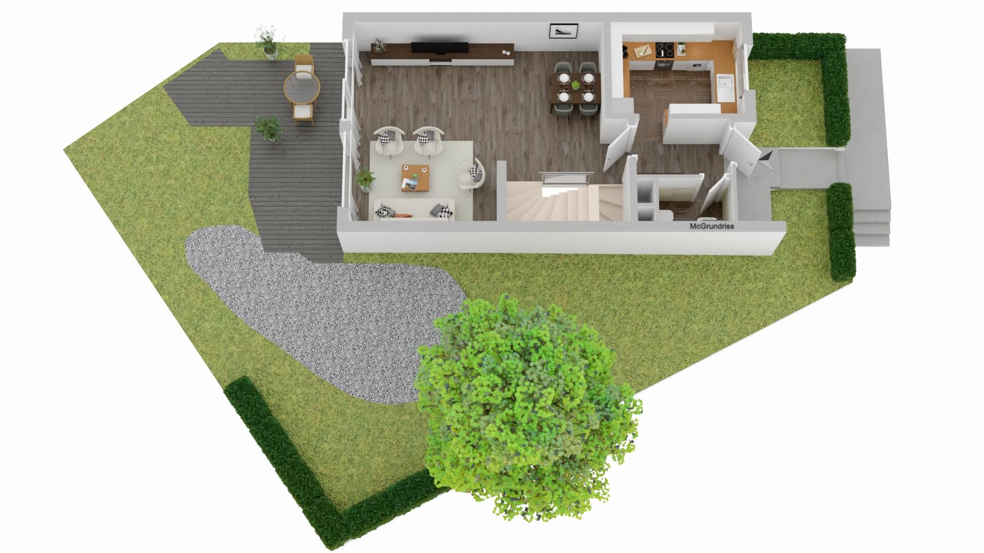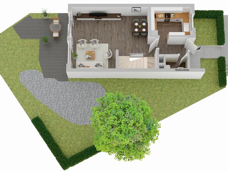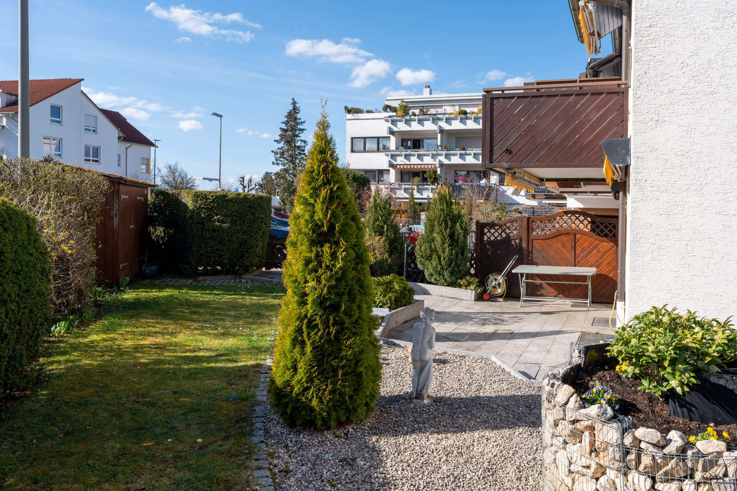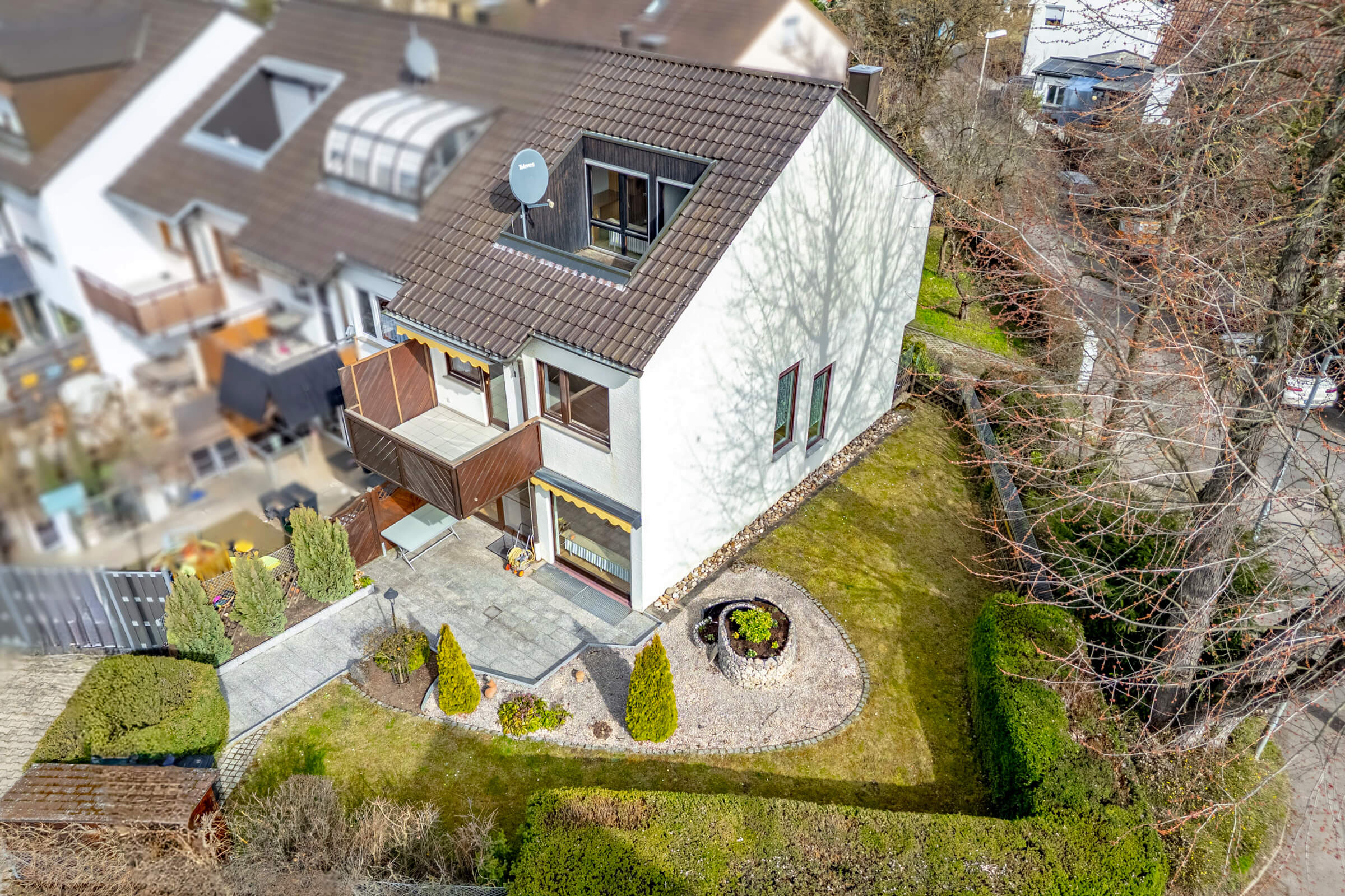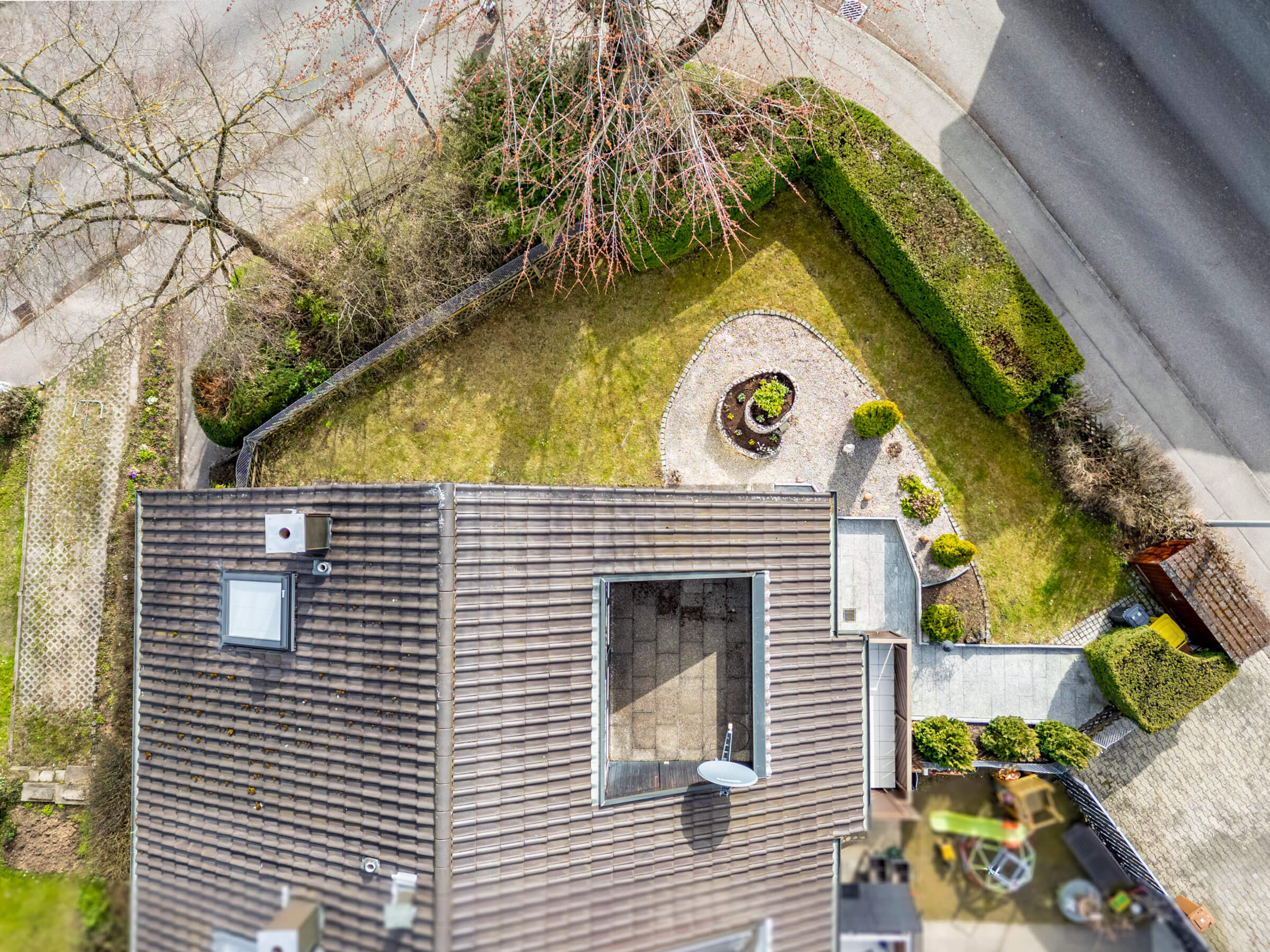 Der Garten auf dem Eckgrundstück bietet Platz für Kinder zum Spielen, für eigene Gartenideen oder einfach für entspannte Stunden im Freien. Balkon und Dachterrasse erweitern den Wohnraum zusätzlich nach draußen und schaffen weitere Rückzugsorte für den Alltag und die warmen Monate des Jahres.