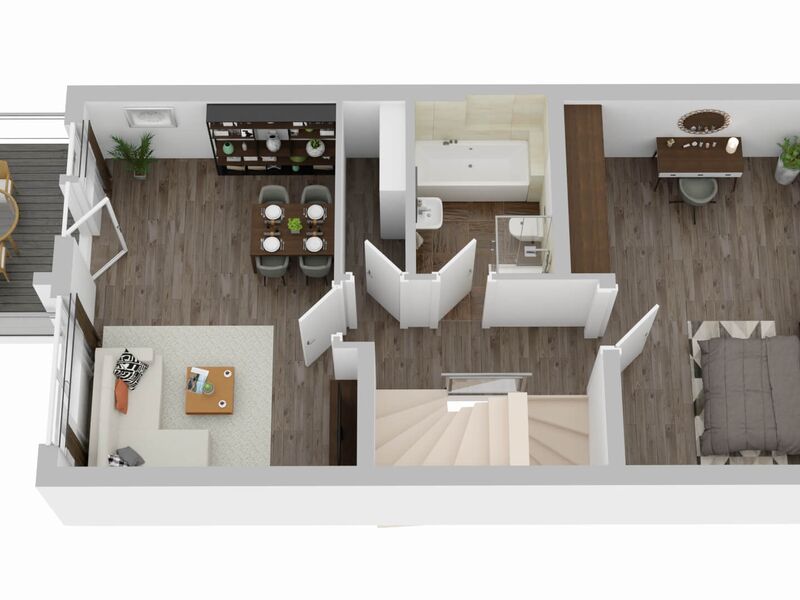 Der Wohn- und Essbereich im Erdgeschoss bildet das Herzstück des Hauses. Große Fensterflächen sorgen für viel Tageslicht und schaffen eine angenehme Wohnatmosphäre. Von hier aus gelangt man direkt auf die Terrasse mit rund 17,8 m² sowie in den Garten. So entsteht ein Wohnbereich, der Innen und Außen auf schöne Weise miteinander verbindet.