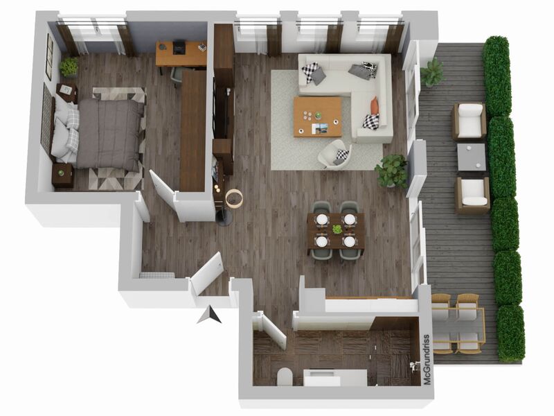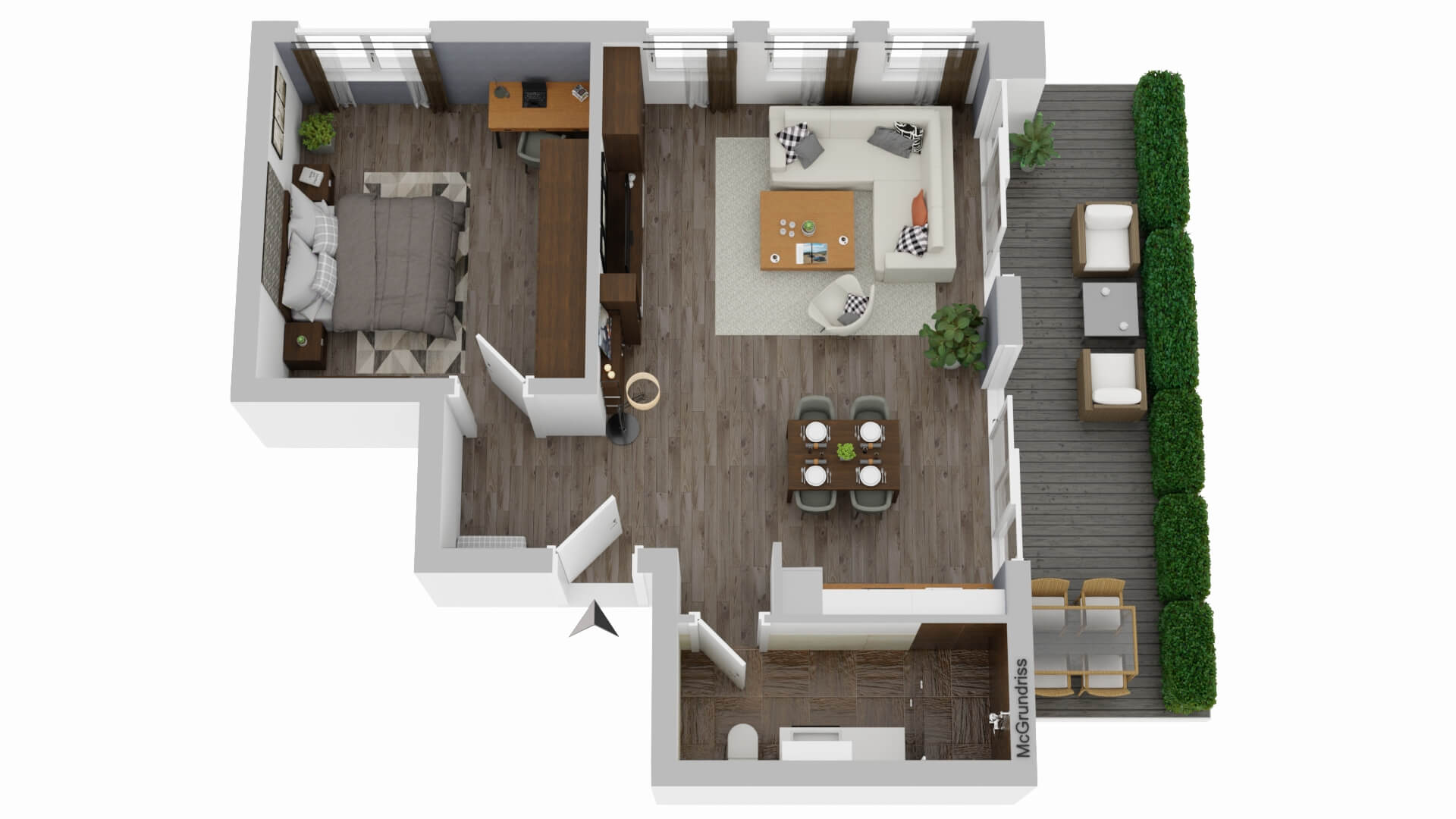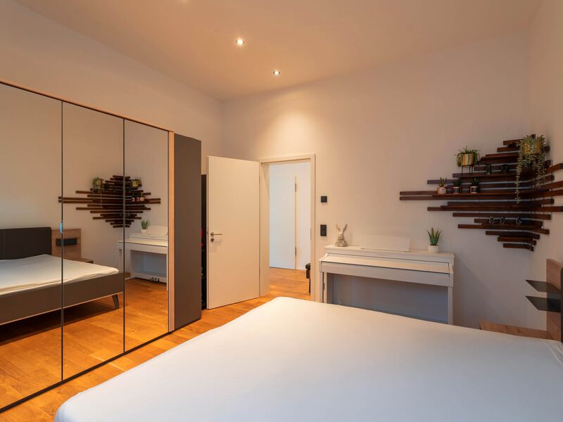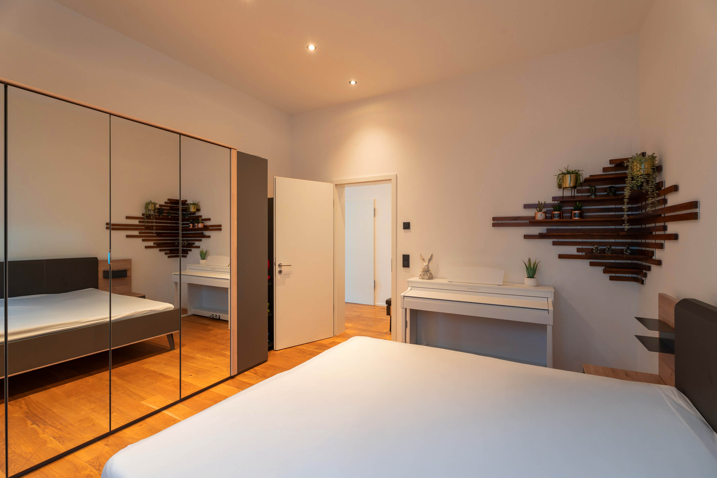 ➤ Schlafzimmer mit ruhigem Schnitt Platz für ein großes Bett und einen Kleiderschrank – ein klarer, ruhiger Raum zum Abschalten. Durch den harmonischen Zuschnitt entsteht außerdem genug Platz für einen Arbeitsplatz, was das Zimmer auch für Homeoffice-Tage attraktiv macht.