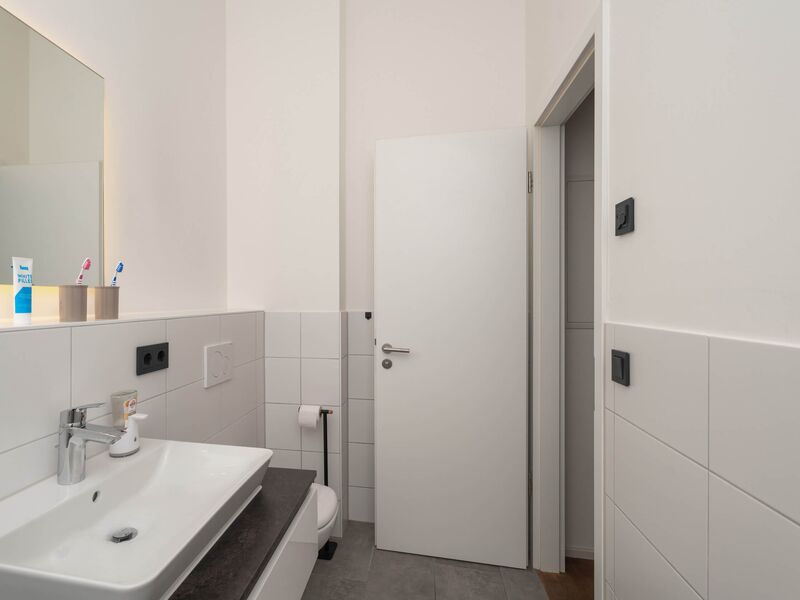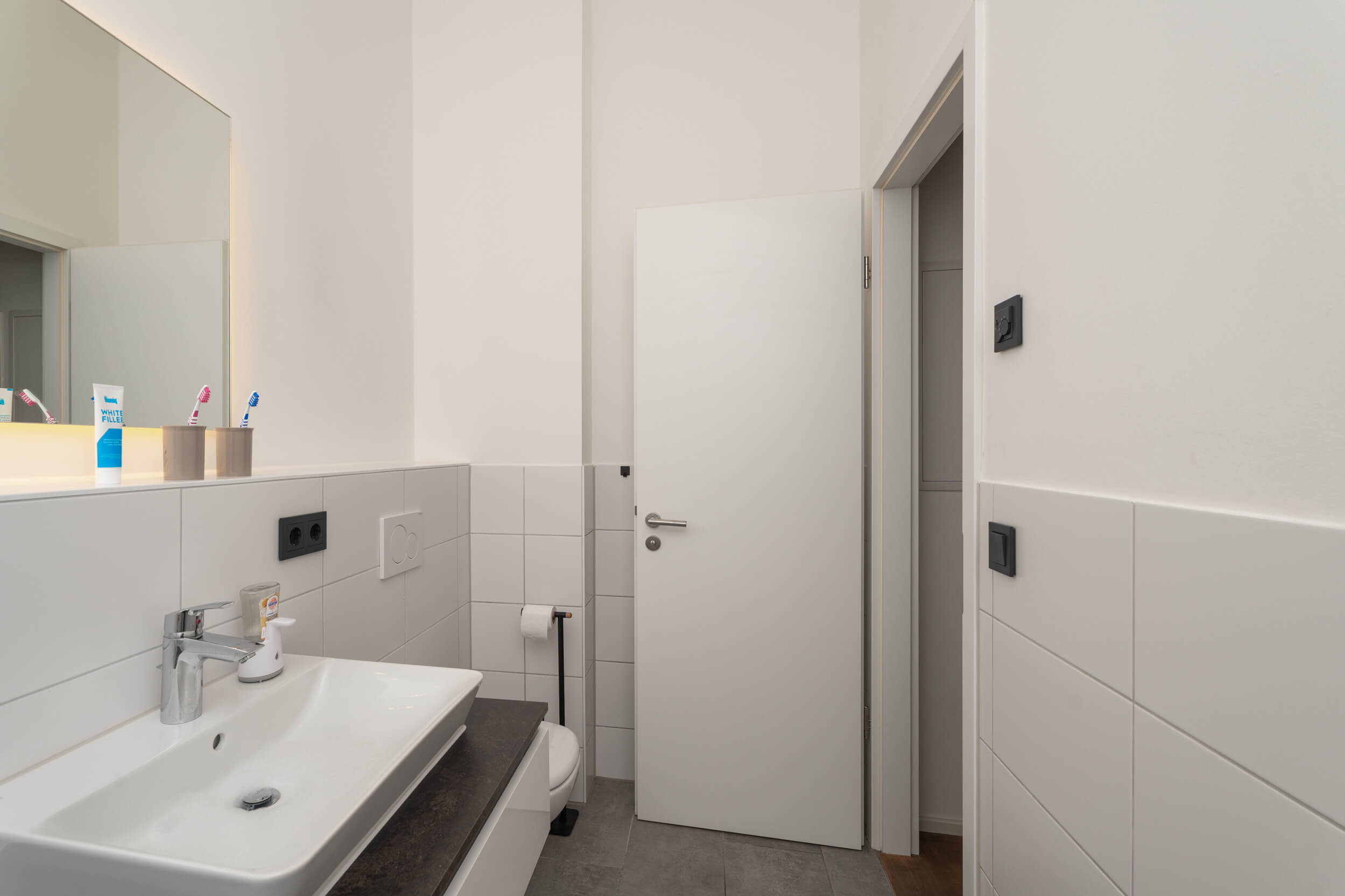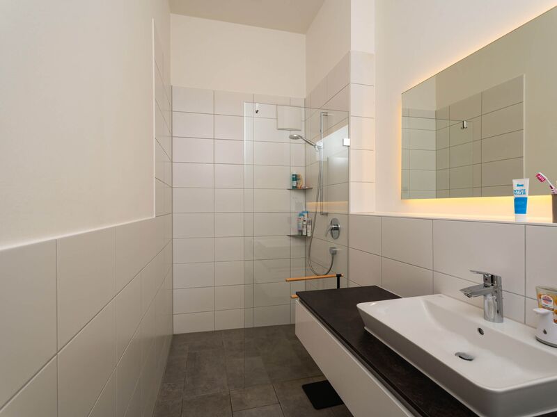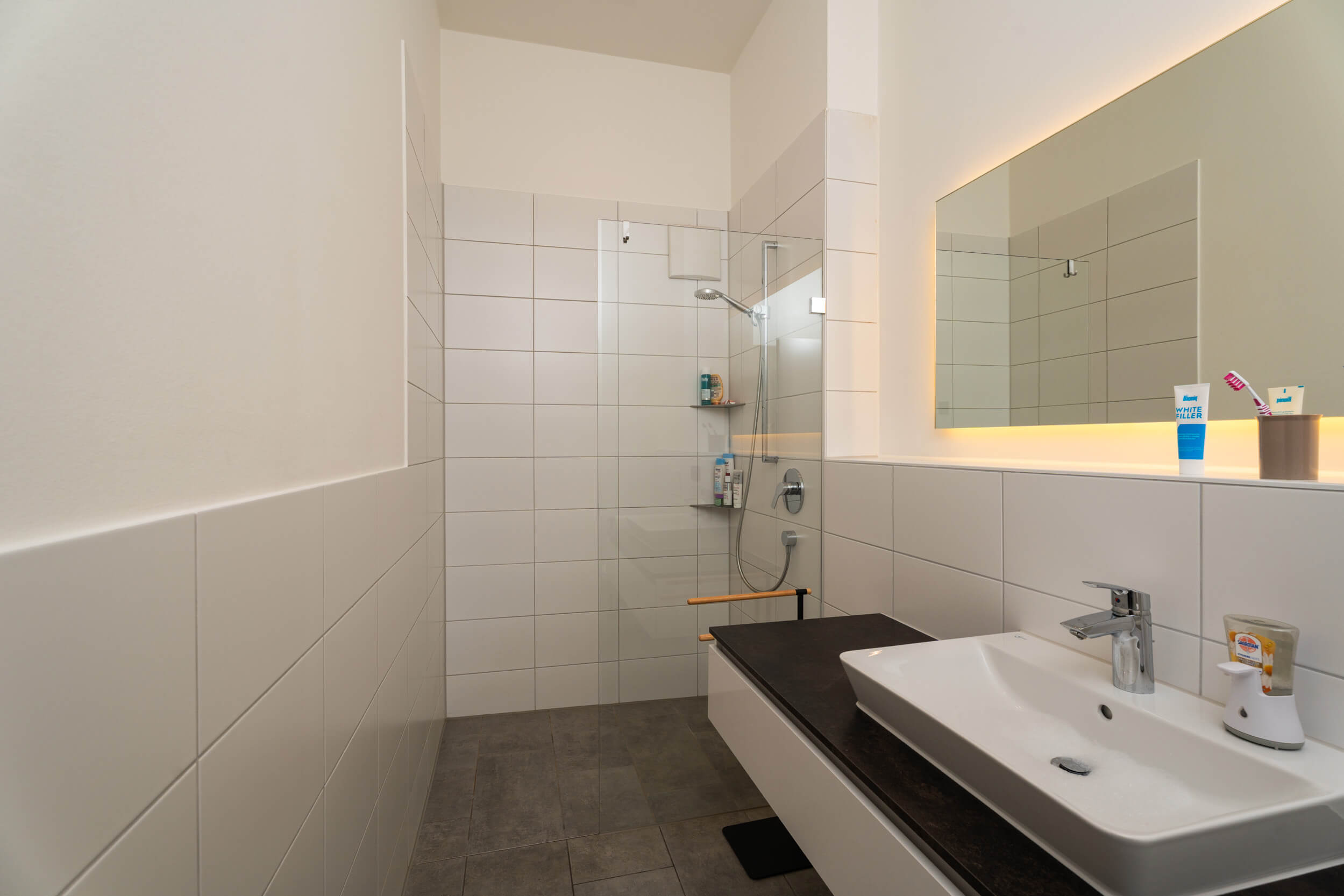 ➤ Modernes Badezimmer mit Wohlfühlfaktor Das Bad wirkt durch den großen Spiegel und die helle Gestaltung angenehm großzügig. Die bodentiefe Walk-In-Dusche, ein schwebender Waschtischunterschrank, praktische Ablagen und ein Handtuchheizkörper runden den hochwertigen Eindruck ab.