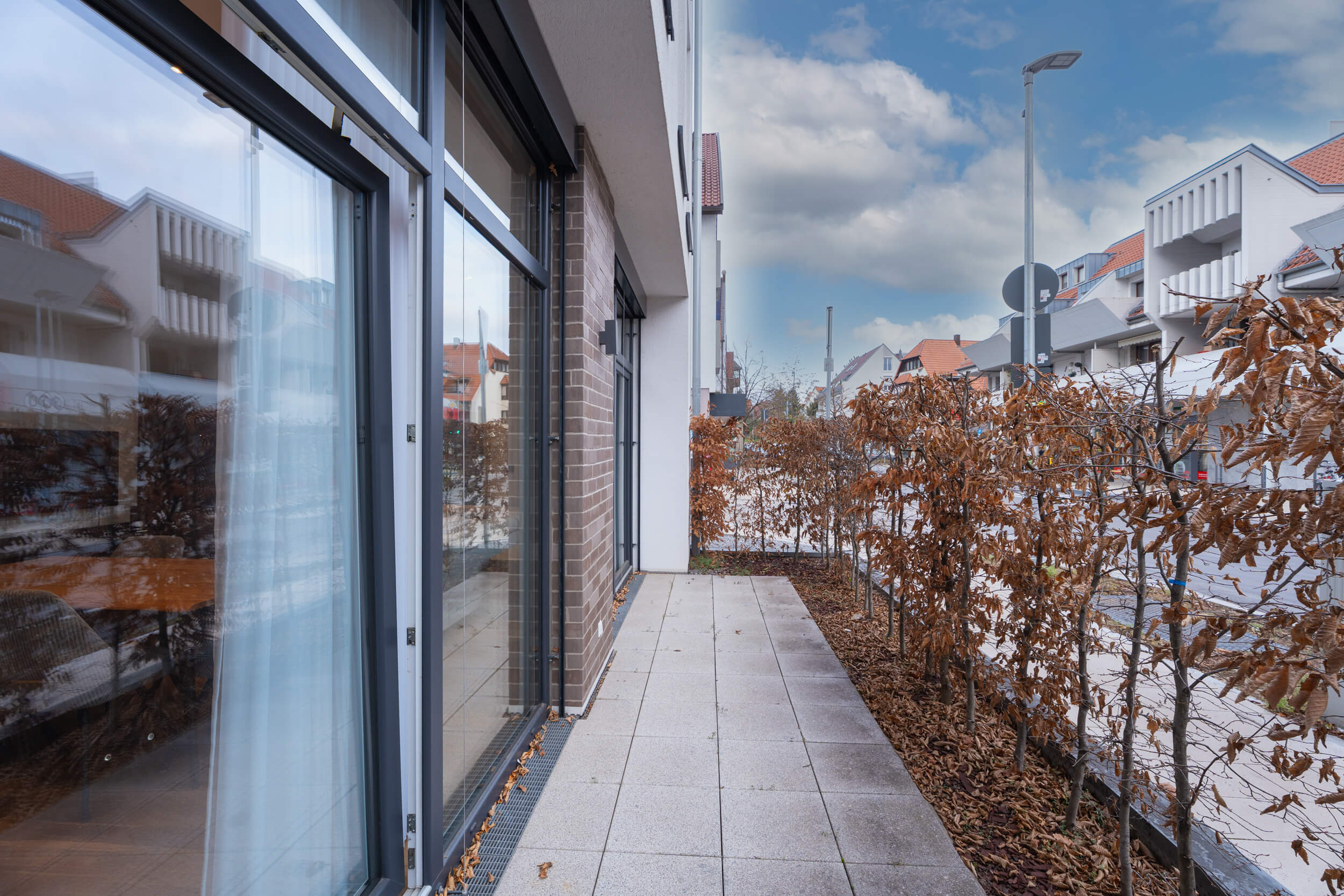 ➤ Terrasse über die gesamte Fensterfront Die Terrasse erweitert den Wohnraum nach draußen und bietet mit der Hecke angenehmen Sichtschutz. Ideal für entspannte Stunden im Freien.